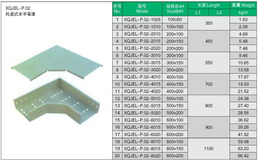 XQJEL_P.02托盤式彎通產品型號、規格、重量等參數及XQJEL_P托盤式電纜橋架在不同跨距下允許均布載荷變形量。