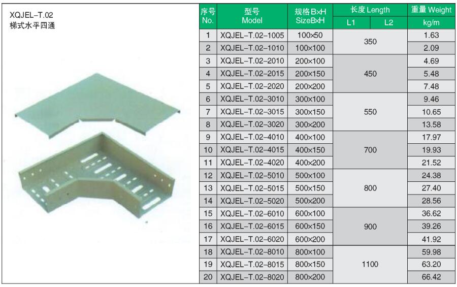 XQJEL_T.02梯式彎通產品型號、規格、重量等參數及XQJEL_T梯式電纜橋架在不同跨距下允許均布載荷變形量。